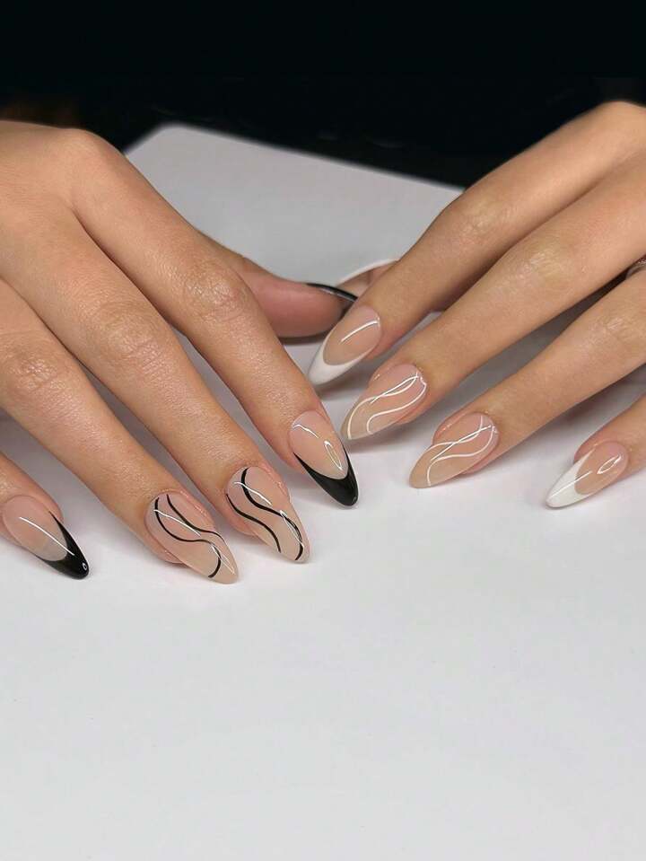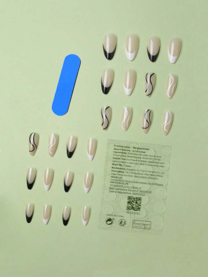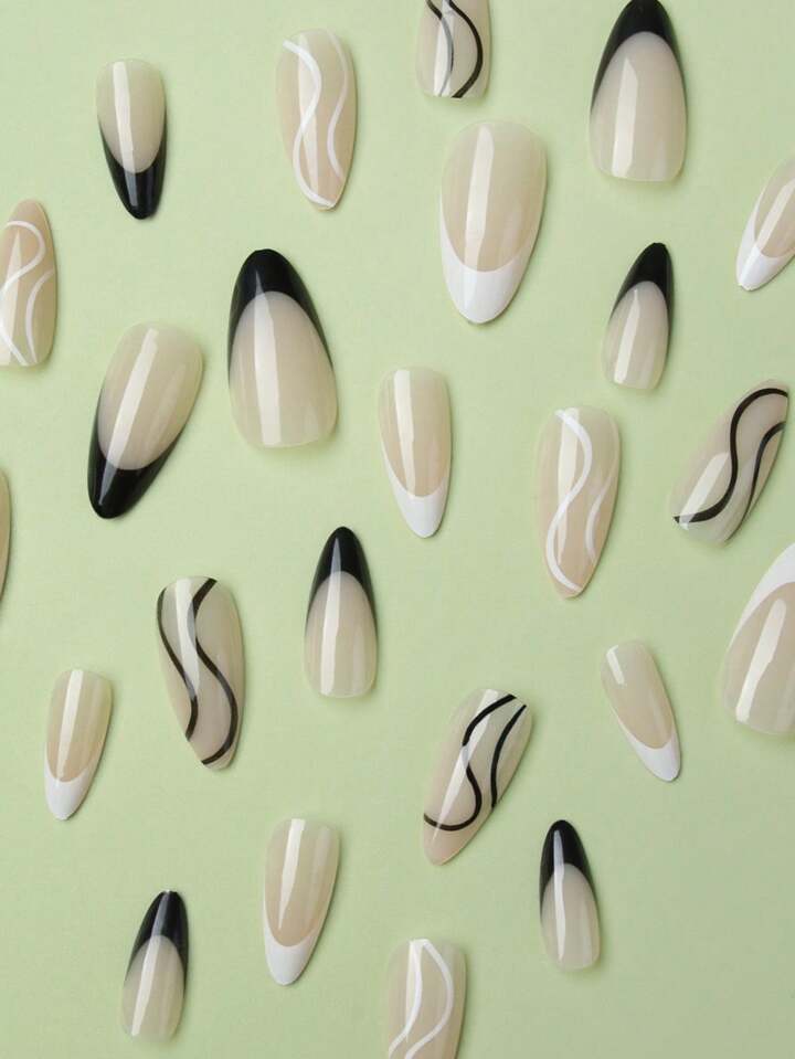 (in-stock Product) 24pcs Almond Shaped False Nails With Black And White Stripes Design, Including Jelly Gum
